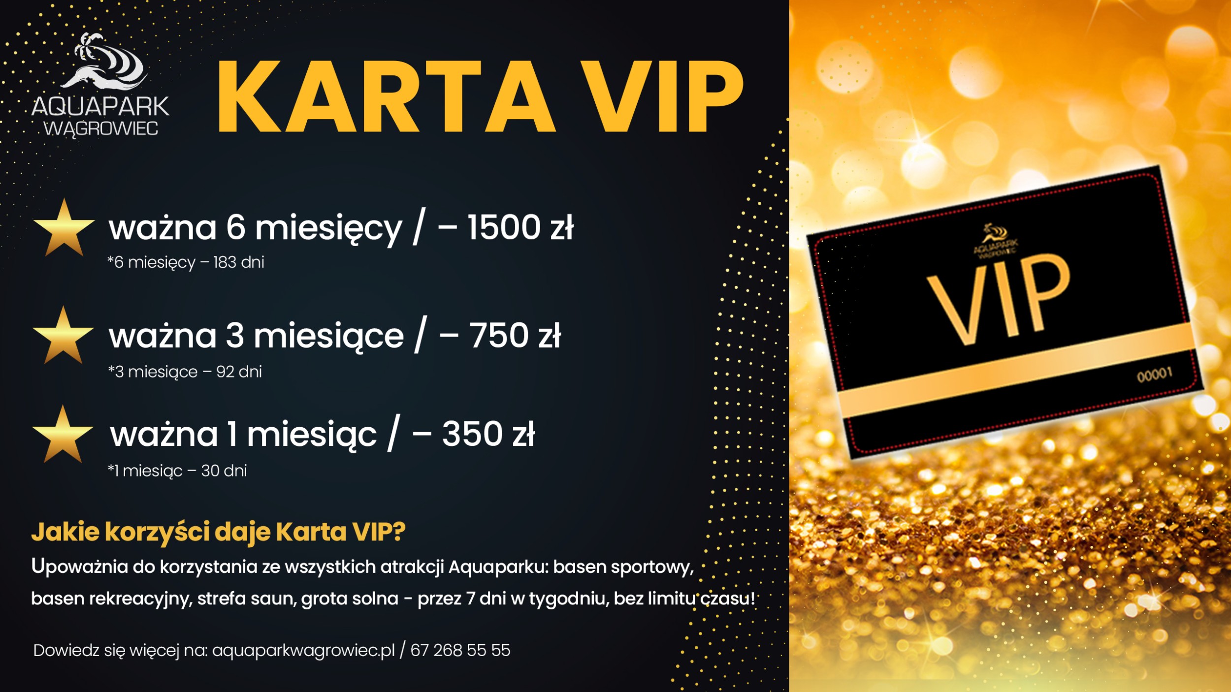Upoważnia do korzystania ze wszystkich atrakcji Aquaparku: basen sportowy, basen rekreacyjny, strefa saun, grota solna - przez 7 dni w tygodniu, bez limitu czasu.